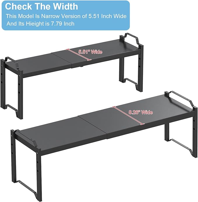 - 【𝗔𝗱𝗷𝘂𝘀𝘁𝗮𝗯𝗹𝗲 𝗟𝗲𝗻𝗴𝘁𝗵 𝗮𝗻𝗱 𝗛𝗲𝗶𝗴𝗵𝘁】: ---The package includes 2 pieces of kitchen cabinet shelf of size (12.5"-20.5")L * 5.51"W * 7.79"H. Both can expand length from 12.5" to 20.5" and adjust shelf height from 3.8" to 6.1" to fit your storage needs just about anywhere.