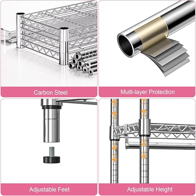 Heavy Duty Rolling Garment Rack 3 Tiers Adjustable Wire Shelving Clothes Rack with 2 Rods and Side Hooks,Storage Closet Clothing Rack with Wheels Chrome 15.7" D x 45.3" W x 79.6" H