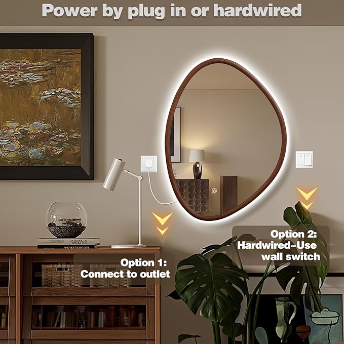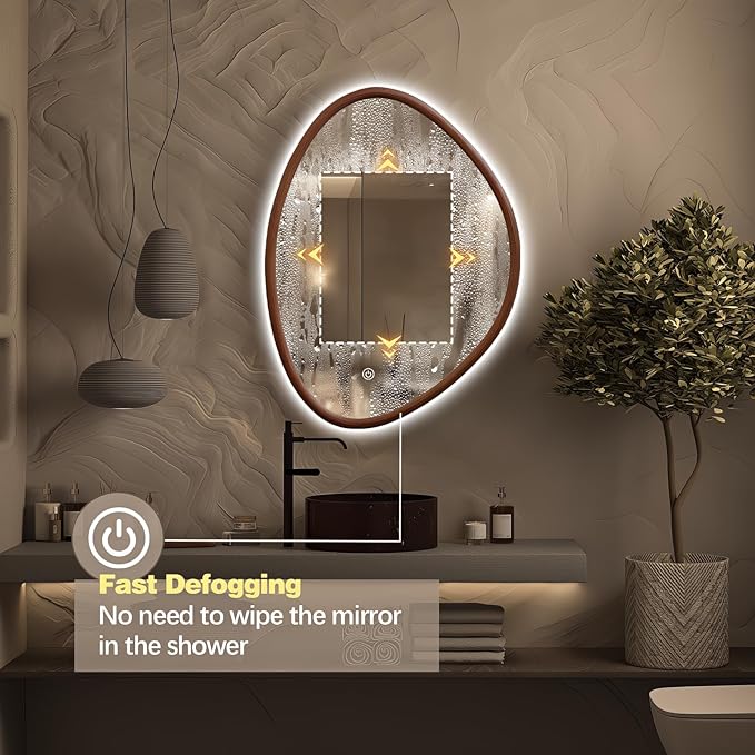 - 【Irregular Wood Led Mirror】 TheiaMo illuminated mirror features a unique irregular line design combined with a high-brightness strip of light that not only blends in perfectly with any style of interior, but also brightens and brightens the room, creating a sense of ambience.
