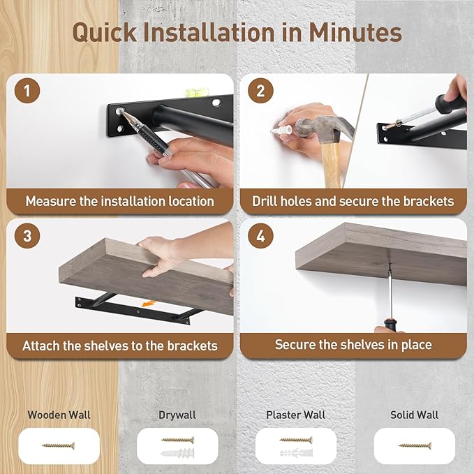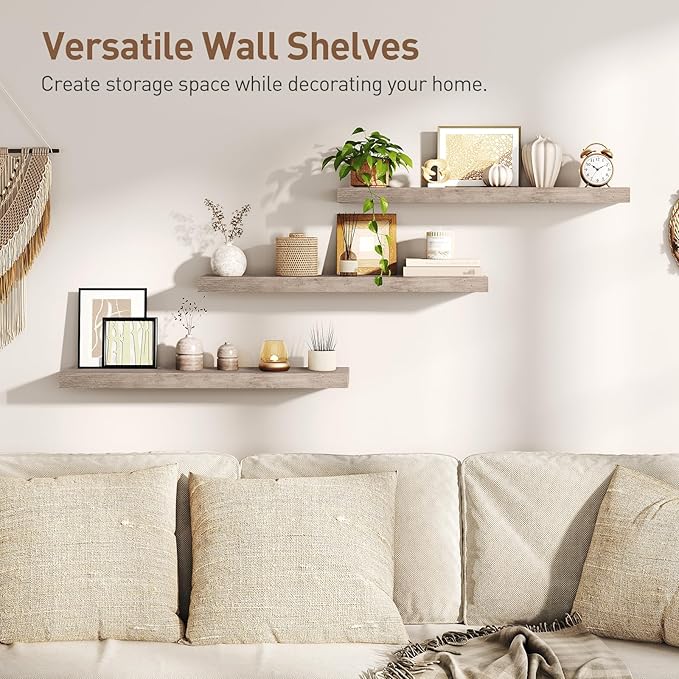 - Sleek Design: Featuring a classic wood grain finish, the floating shelves for wall add a natural warmth to your decor and are easy to clean. Use it to organize bathroom essentials or display books and photo frames, enhancing the aesthetic appeal of your home