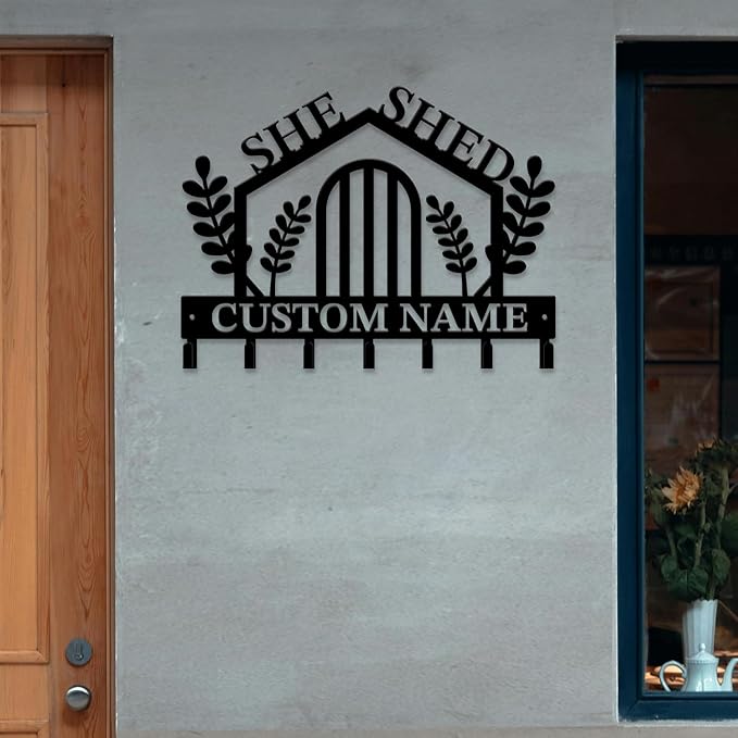 - Custom She Shed Wall Hooks Metal Signs: Crafted with precision, these personalized metal signs are ideal for your She Shed, kitchen, or office, bringing a stylish and practical touch.