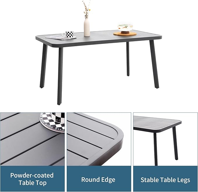 - STURDY ALUMINUM FRAME: Crafted from high-quality powder-coated aluminum, this dining table can last for years of outdoor use. This table is wide enough for you to accommodate 4 to 6 people and you can move it around easily because it is much lighter than metal dining table. Constructed with waterproof and rust-resistant aluminum structure, this dining table is both functional and decorative, and its metallic texture complements the overall modern style.