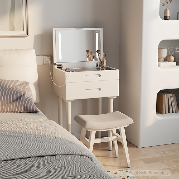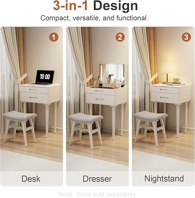 - 【Space-Saving 3-in-1 Vanity】Just 19.6" wide, this makeup desk works as a vanity, desk, or nightstand. Close mirror for a flat surface. Adjustable feet ensure stability, and anti-tip kit adds safety
