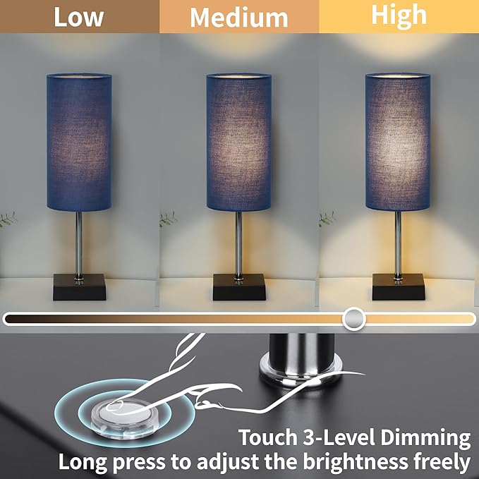 - Dimmable Bedside Lamp - This living room table lamp offers 3 levels of brightness (low, medium and high). Simply touch the dots to adjust the light to meet your different needs. The low brightness of the nightstand table lamp allows you to sleep or nurse peacefully. The medium brightness of the living room lamp allows you to watch TV shows or movies and enjoy cozy moments. The reading lamp lights up again with high brightness for studying or working. You can find the perfect lighting atmosphere effortlessly
