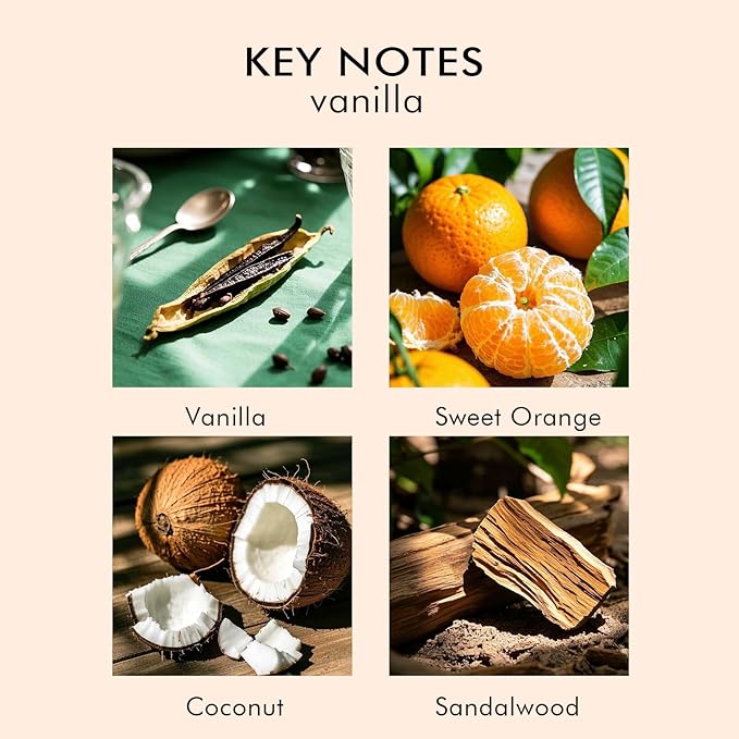 - Sunlit Bliss: A creamy fusion of vanilla and coconut, brightened with sweet orange and grounded by smooth sandalwood for a warm, tropical escape