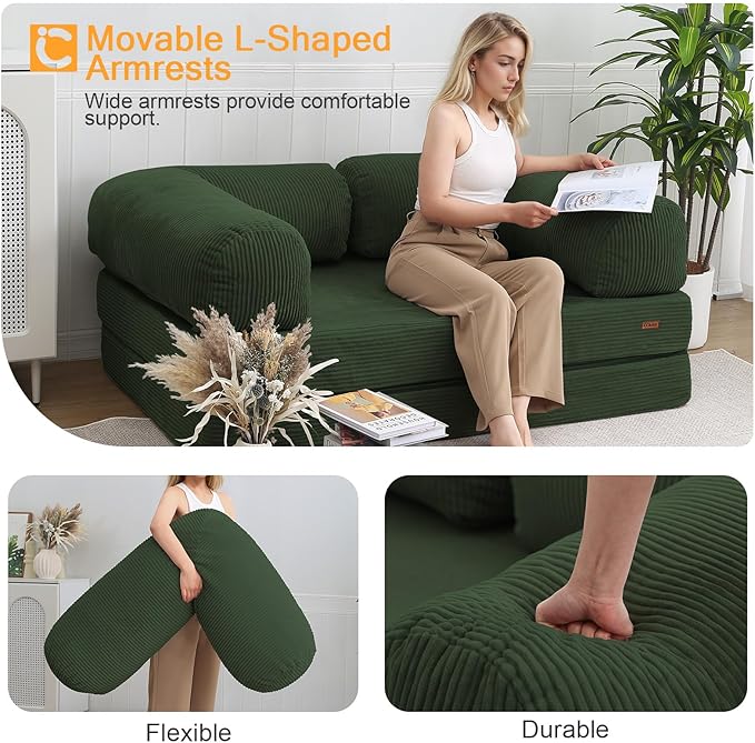 COMAX 4‑in‑1 Futon Sofa Bed Queen – Floor Foldable Convertible Sofa Couch with L‑Shaped Armrests, Removable Cover, Green Convertible Guest Bed | Space‑Saving Fold‑Out Mattress Lounge for Living Room