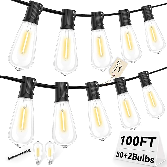 - đ„ăExtra Long Coverage & Cozy AmbianceăWith an impressive length of 100 feet and 50 energy-efficient 0.6W LED bulbs (plus 2 spares), these outdoor string lights elegantly illuminate patios, porches, decks, or gazebos, creating a warm and inviting atmosphere perfect for any occasion, from backyard dinners to bistro settings.