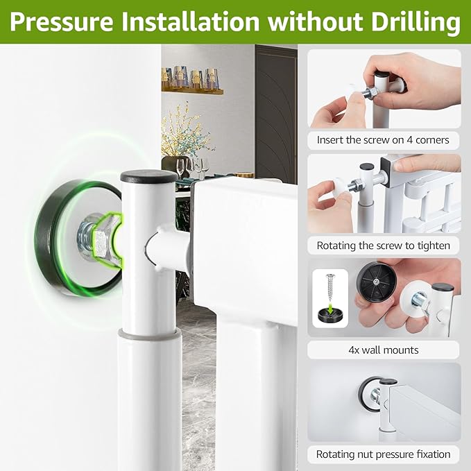 - 【Rich Accessories, Sturdy Structure】The extra tall pet gate kit includes various accessories: 4x bolts, 4x wall mounts, 4x double side tape, 4x screws, 2 extenders, and 1 dedicated wrench. The dog door features a steel design that can withstand the impact of pets up to 100 pounds, ensuring long-lasting durability.