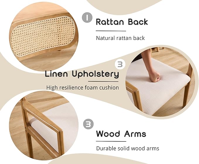 - 【Breathable Rattan Back】The combination of natural rattan backrest and solid wood frame adds a comfortable and warm atmosphere to your home. The toughness and good breathability of the rattan back allow you to feel slightly elastic when sitting down, while providing comfortable support for your back