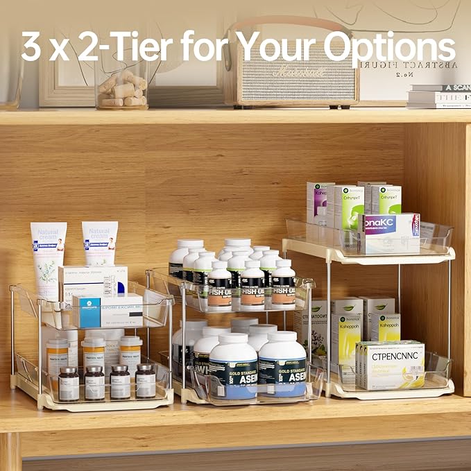 - Multiple Innovative Combinations: Stackable and configurable into "2 + 2 + 2" / "1 + 2 + 3" at will for specific needs. With "2 + 2 + 2", you'll have three 2-tiered slide out sink organizers that can work independently. Imagine one for kitchen organizers and storage, another as bathroom organizers and storage, and the third for cabinet organizers and storage.