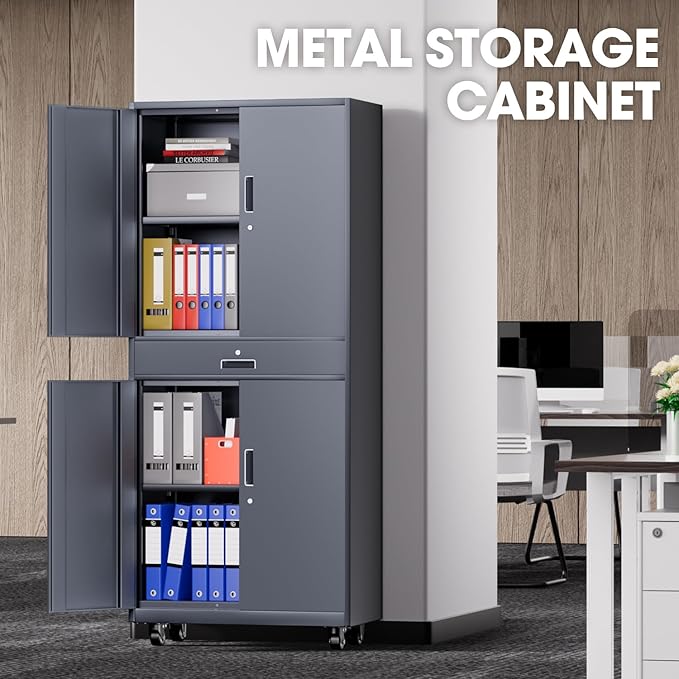- HIGH QUALITY MATERIAL - The storage cabinet is made of strong and durable cold-rolled steel. Storage shelf with doors features a one-piece reinforced heavy-duty metal frame. Coated with environmentally friendly powder for a protective layer to prevent corrosion and moisture damage, providing extended service life