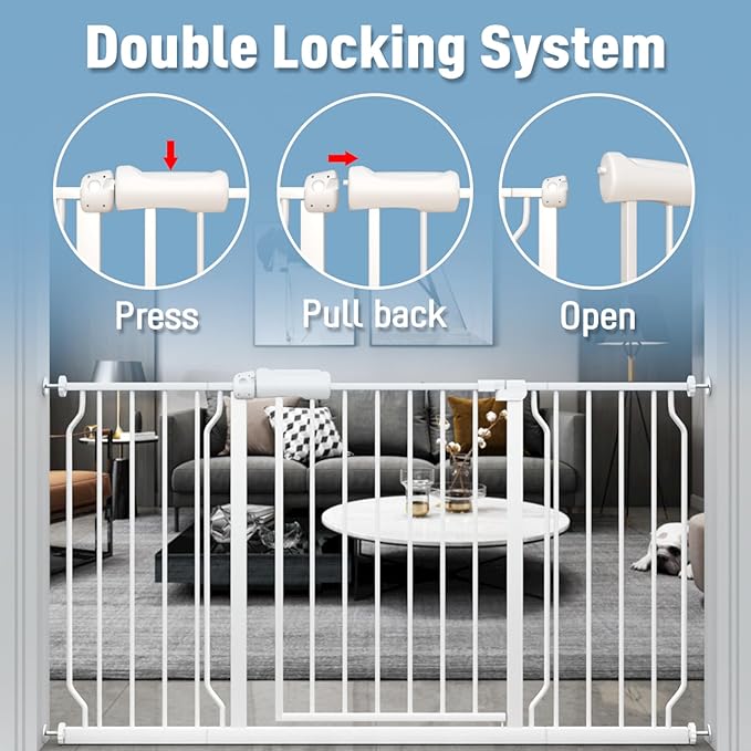 - 【Safe for Baby】Your curious crawlers will be "blocked" by the safety extra wide baby gate because we design the double-lock safety release which makes it difficult for toddlers to open the gate ,but adults can operate with one hand and pass quickly.