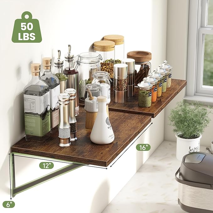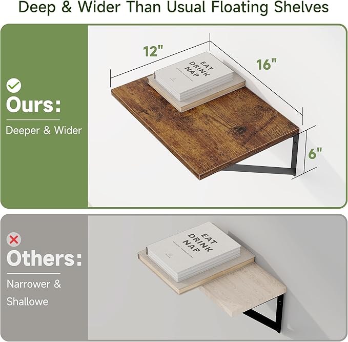 - 【12 inch Deep Floating Shelf】Our deep floating shelves set of 4 are 16" long x 12" deep. These deep wall shelves are wider and deep than regular shelves on the market, providing more room and worry-free storage! Supported by heavy duty triangular metal brackets, these wall shelves can hold up to 50 lbs.