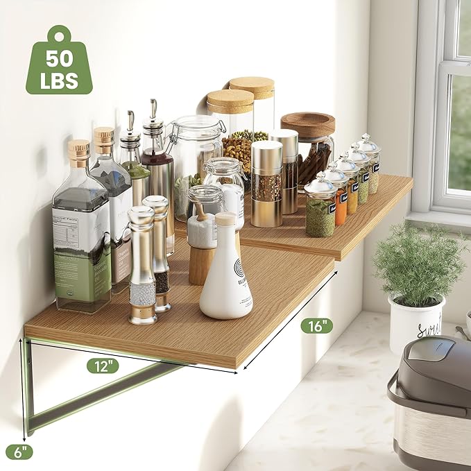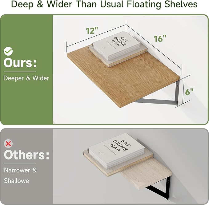 - 【12 inch Deep Floating Shelf】Our deep floating shelves set of 4 are 16" long x 12" deep. These deep wall shelves are wider and deep than regular shelves on the market, providing more room and worry-free storage! Supported by heavy duty triangular metal brackets, these wall shelves can hold up to 50 lbs.