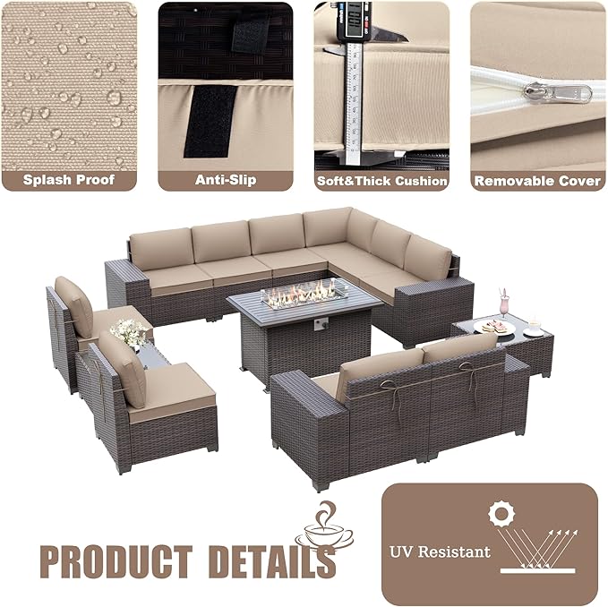 Kurapika 13 Pieces Patio Furniture Set, Rattan Wicker Outdoor Conversation Sets w/43in Propane Fire Pit Table(Sand)
