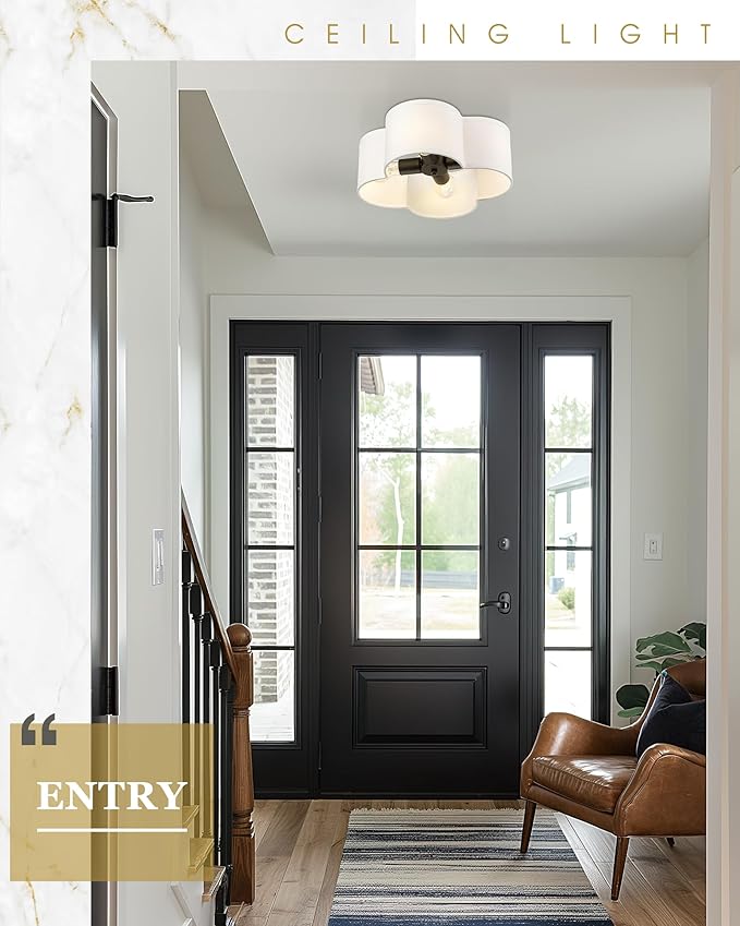 - Farmhouse Style: Elevate your space with the rustic elegance of our farmhouse flush mount ceiling light. Featuring a fabric shade in quatrefoil shape and matte black finish, it exudes a minimalist vintage vibe, adding character to any room. Illuminate your space while showcasing your unique style
