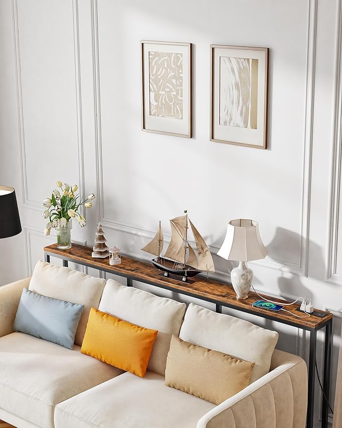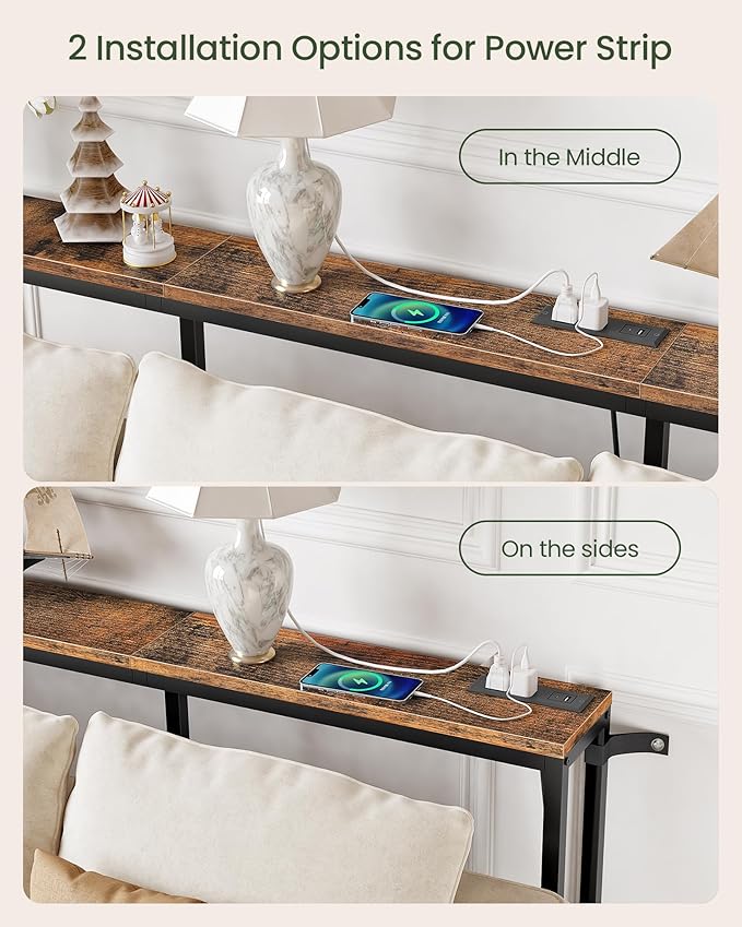 - Flexible Charging: The narrow long sofa table comes with a power strip that has 2 standard outlets, 1 USB-A port, and 1 Type-C port. It can be installed on the side or in the middle, making it easy to charge phones, tablets, and lamps