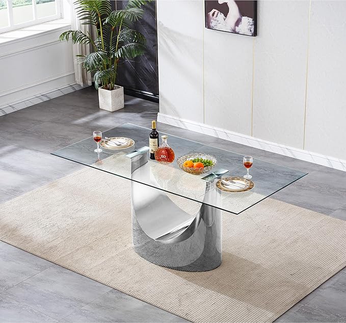 HomVent Modern Rectangle Glass Dining Table, 70''L x 35.4''W x 30''H, Silver With U Base, Clear Tempered Glass Top, Stainless Steel Base