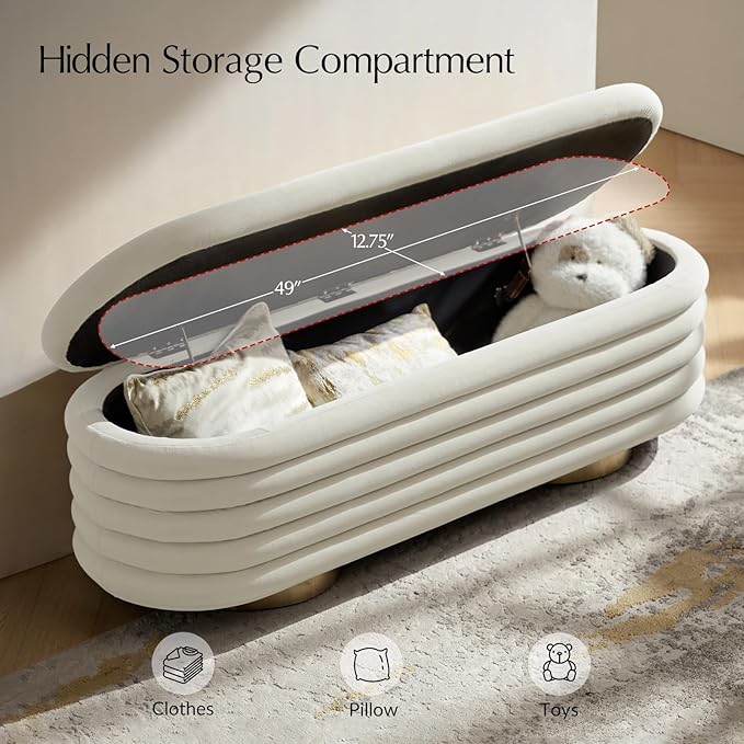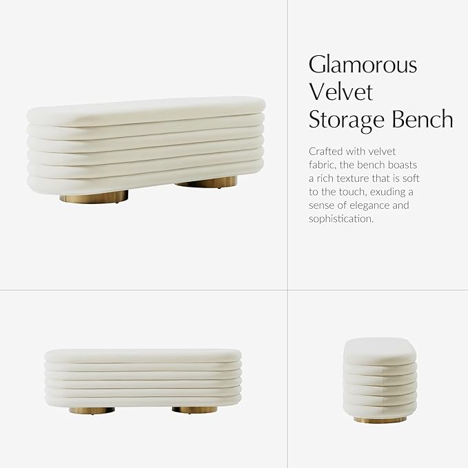 HULALA HOME Velvet Storage Bench, Large Upholstered Ottoman with Button Tufted Design for Living Room, Bedroom, Entryway, or Window, End of Bed Bench with Shoe Storage, Modern Home Decor, Ivory