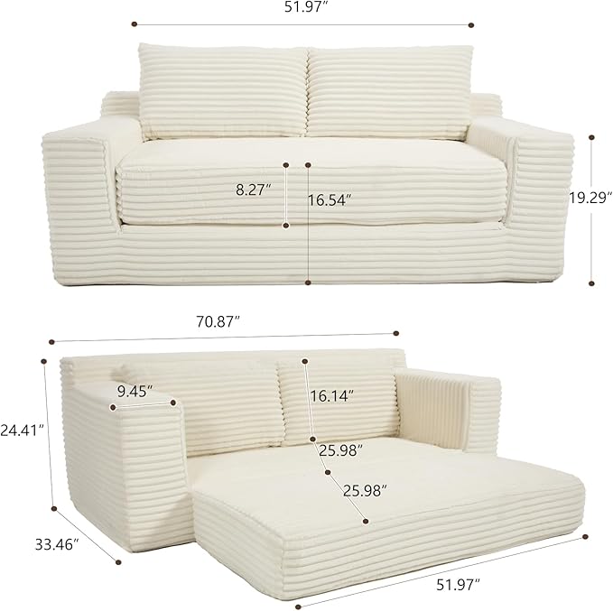 Fefances Loveseat Sofa Bed Boneless Couch, Convertible 2-in-1 Design, Corduroy Fabric - Compact Memory Foam Couch for Small Spaces, Apartments, Home Office & Bedroom (Beige)