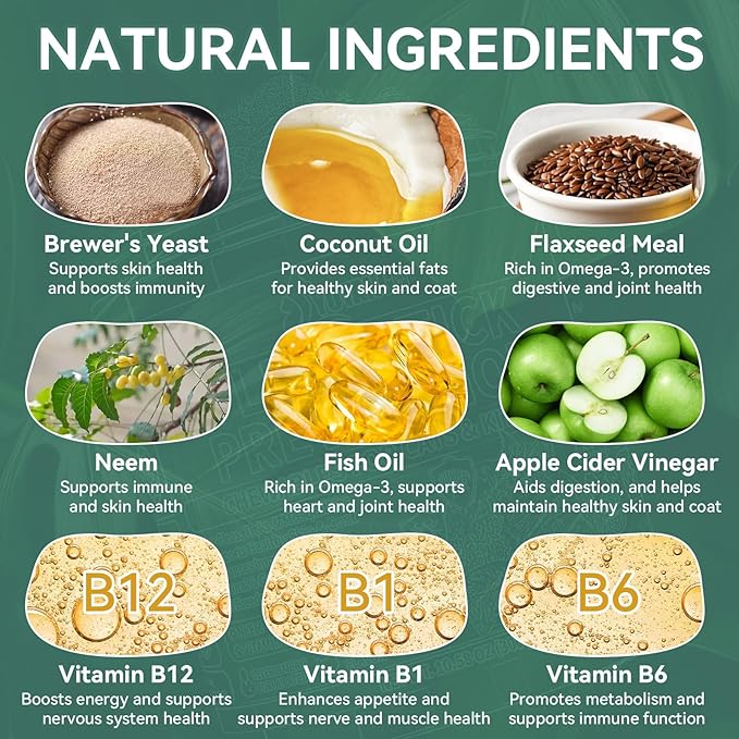 - Skin & Coat Care: Each of our cat flea and tick treatment chewable is made with natural fish oil and is rich in vitamins B1, B12, and B6. These ingredients not only increase your cat's immune function but also nourish and protect their skin, promoting a shiny, healthy coat. With daily use, they improve the appearance of your cat's fur while effectively supporting flea and tick prevention.