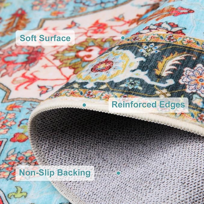 WILLSUN Washable Area Rugs, 4x6 Non-Slip Boho Large Area Rugs for Living Room, Bedroom, Machine Washable Vintage Rug, Indoor Floral Print Carpet for Home Decor, Kid & Pet Friendly Mat