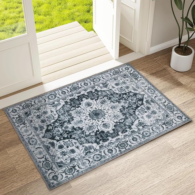 WILLSUN Washable Area Rugs, 2x3 Non-Slip Boho Small Area Rugs for Entryway, Kitchen, Bathroom, Machine Washable Vintage Rug, Indoor Floral Print Carpet for Home Decor, Kid & Pet Friendly Mat