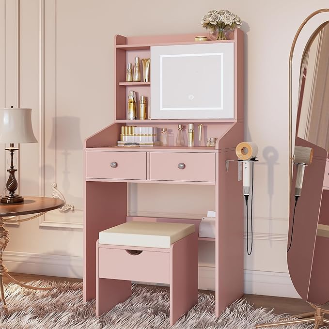 Vanity, Small Vanity Desk with Sliding Mirror, Dimmable LED Lights, 2 Drawers,Vanity Table Ideal for Bedroom(Pink)