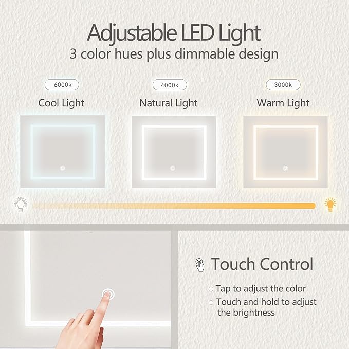 - 【DIMMABLE LED LIGHTING】With 3 pro lighting modes, this vanity mirror ensures flawless makeup application. Tap to change colors or hold to dim—set the perfect light for any moment.