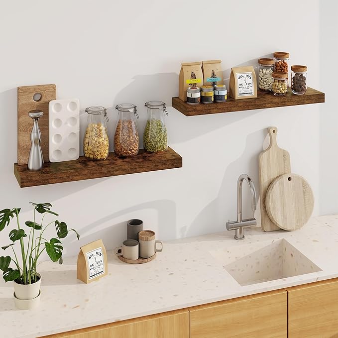 - Elevate Your Decor: These rustic wood floating shelves are the perfect addition to any room, offering ample space to display decor or store essentials. Made with premium engineered wood, they seamlessly blend with various interior styles, adding a touch of charm and sophistication