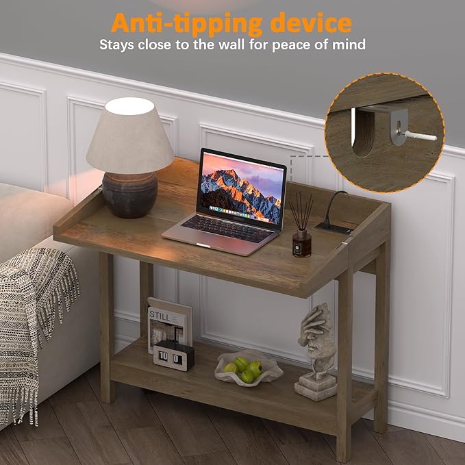Foldable 38" Console Table with Charging Station & Storage, Side Table with Charging, Entryway Table with Anti-Tip Design,Rustic,Rustic Brown