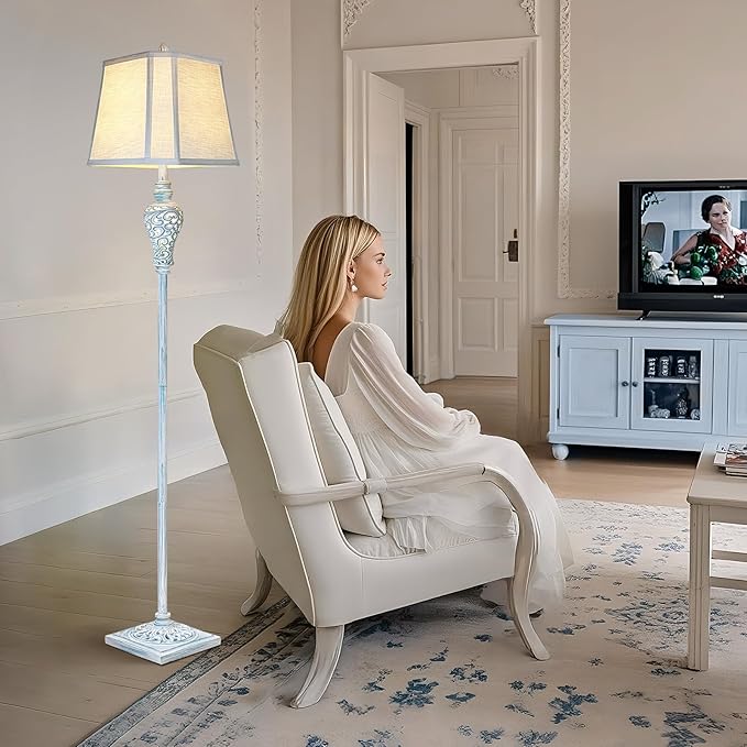 - UNIQUE DESIGNS: This farmhouse floor lamp combines vintage charm with luxurious style. Exquisite hollow carved leaves on the base and night light make it look elegant and beautiful. The lamp body is made of durable resin and metal with washed blue finish.