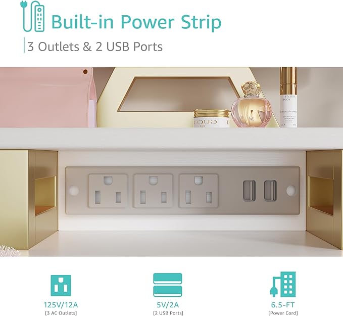 - Convenient Power Access: Stay connected with built-in 3 plug sockets and 2 USB ports, perfect for charging your phone, tablet, or hair tools while you get ready. Enjoy the ultimate convenience at your fingertips