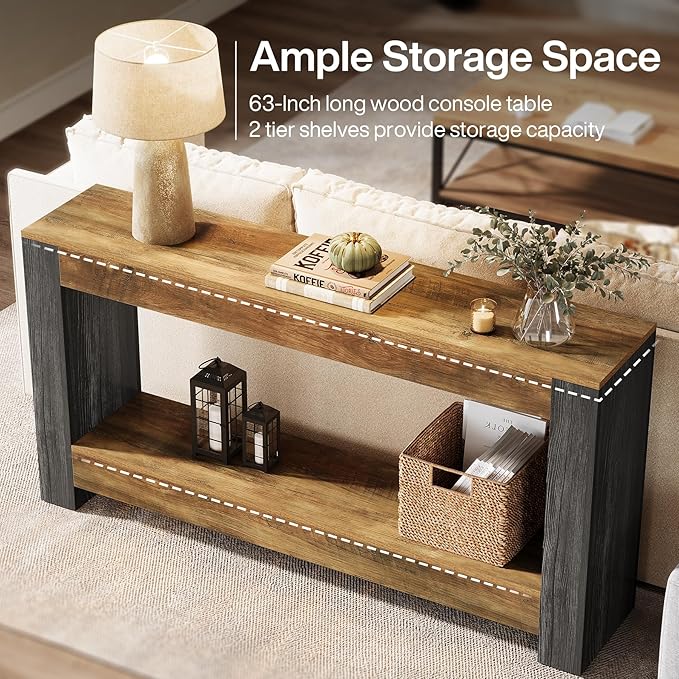 Tribesigns 63-Inch Long Console Table for Entryway, Farmhouse Wood Sofa Table Behind Couch for Living Room, Hallway, Entrance, Foyer, Rustic Brown & Black