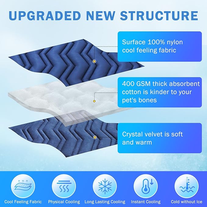 - 2025 UPGRADED PET COOL SENSE MAT FOR YEAR-ROUND COMFORT: Our upgraded cool mat has a double sided design with 100% nylon cool sense fabric on the surface, 400 gsm cotton center fill, and soft, breathable crystal fleece fabric on the back. In summer it is a cooler mat, in other seasons it is a warm pad, which can be used all year round. Ripple quilting design can better keep the mat flat and stretch, with anti-wrinkle function, bring comfort and coolness to your dog's body