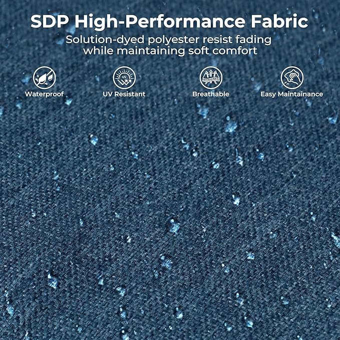 - PERFORMANCE: Our high-performance beige polyester fabric for cushion is rated at 1200 UV hours - three higher than typical polyester- to provide years of fade resistance and water resistance, more durability, easier to clean, and skin-friendly soft. 3.5-inch cushions provide an upgraded comfort and back support