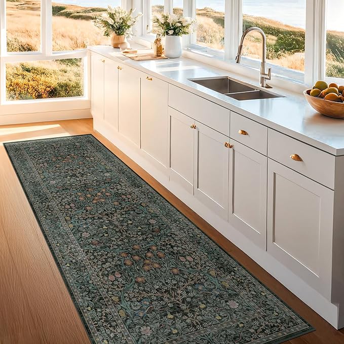 Dark Green 3x10 ft Extra Long Wide Runner Rug for Hallway Non Slip Washable, Large Kitchen Indoor Floor Rugs for Entryway Bathroom Bedroom, Stain Resistant Vintage Floral Carpet