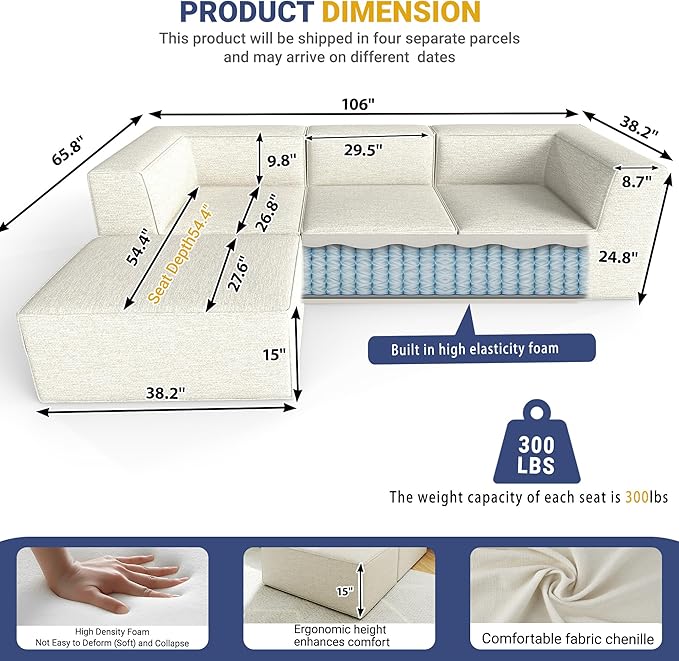 106" Sectional Compressed Sofa Modular Couches L-Shape with Chaise,High-Density Foam No Assembly Required,4-Piece(2xCorner 1xArmless 1xOttoman) for Living Room Chenille Beige
