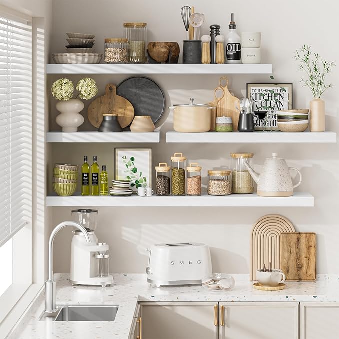 - Perfect Wall Decor: Handcrafted from premium 1.5" thick wood, our wood floating shelves boast a unique wood grain that infuses your space with timeless charm. Perfectly suited for any modern, traditional, rustic, or farmhouse decor, this shelf elevates the ambiance of your home and kitchen. With 5 colors and 4 sizes, you can creatively arrange your storage space with your style.