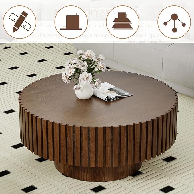 Round Coffee Table, Handcrafted Fluted Drum Coffee Tables Modern Wood Coffee Table Circle Drum Center Table for Living Room, Apartment (Round Brown)