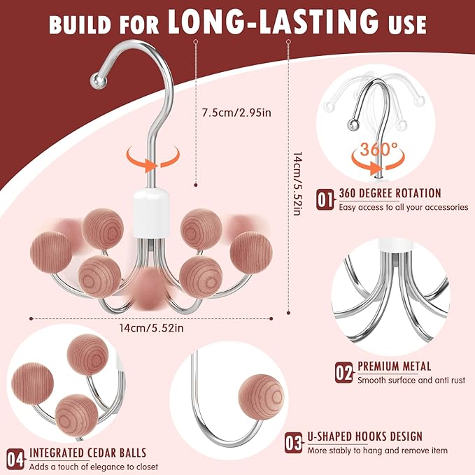 - Durable Metal Structure with Cedar Ball Detail:Made of premium quality metal with a rust-resistant finish, the purse organizer features a unique cedar ball that not only keeps your garments fresh but also adds a touch of natural elegance. The robust U-shaped hooks, making it a reliable purse hangers that won't tip, scratch, or fall. Strong enough to hold up to 30 lbs, making it a long-lasting closet organizer solution