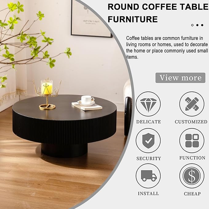 Round Coffee Table, Handcrafted Fluted Drum Coffee Tables Modern Wood Coffee Table Circle Drum Center Table for Living Room, Apartment (Black Thick)