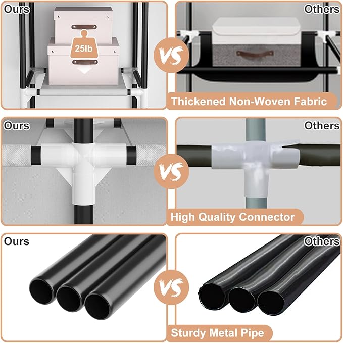 - [Easy to Assemble] The portable closet wardrobe is equipped with a detailed installation instruction manual, just follow the steps of the instruction manual to assemble, and it can be done easily. In addition, we have made an installation video on the page for your reference to help you install faster. NOTE: Make sure all the rods reach the bottom of the plastic connector holes.
