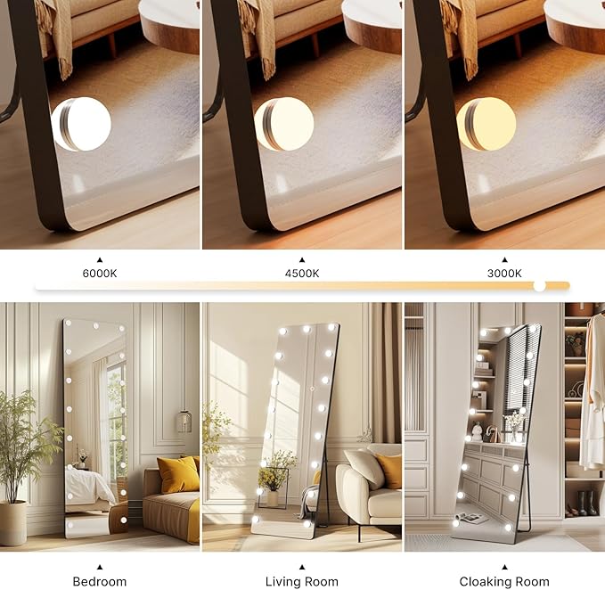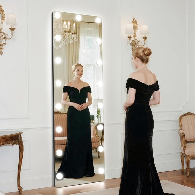 - āØ[Professional Hollywood Lighting] ā This full-length LED mirror features evenly distributed bulbs with adjustable brightness (cool, warm, and natural light), providing perfect illumination for makeup application, outfit checks, and full-body viewing.