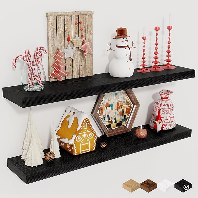 Fun Memories 32Inch Floating Shelves for Wall 2 Pack Wood Shelves for Kitchen, Bathroom, Bedroom Wall Mounted Rustic Wood Floating Shelf with Invisible Brackets for Books, Storage, Decor, Black