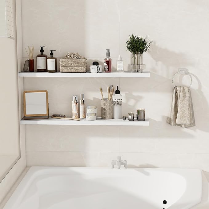 Fun Memories Floating Shelves for Wall, 40 Inch Floating Shelves for Home Decor, Wall Mounted Rustic Wood Shelves, Bathroom, Hanging Deep Shelf for Bedroom, Living Room, Kitchen (White, Set of 2)