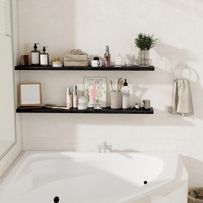 Fun Memories Floating Shelves for Wall, 48 Inch Floating Shelves for Home Decor, Wall Mounted Rustic Wood Shelves, Bathroom, Hanging Deep Shelf for Bedroom, Living Room, Kitchen (Black, Set of 2)