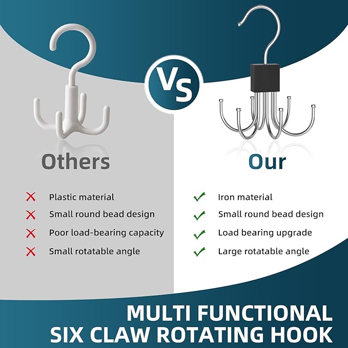 - [360° Rotating Design for Effortless Access] Say goodbye to rummaging through piles of accessories! Our organizer features a 360° rotating top and 6 swivel hooks, allowing you to easily browse and grab your favorite belts, ties, or scarves in seconds. The smooth rotation ensures quick access, saving you time during busy mornings or last-minute outfit changes.