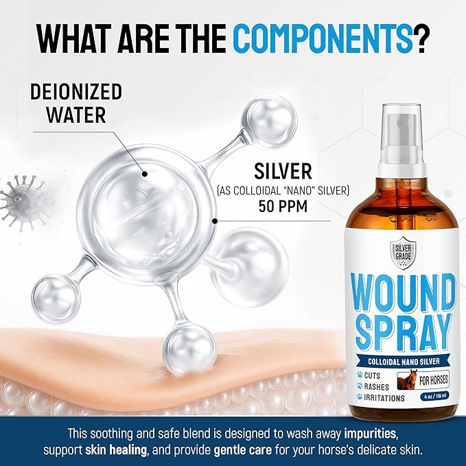 Horse Wound Care Spray with Silver – Wounds, Scratches, Cuts, Abrasions, Itching, Hot Spots, Skin Irritation – First Aid Solution and Breeds – 4 Oz
