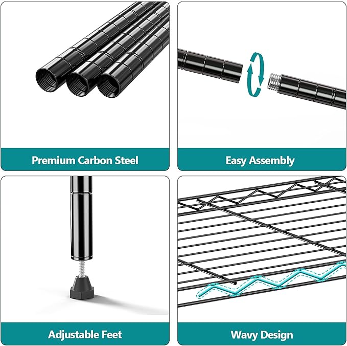 - 【Durable & Strong Build】 Made of powder-coated steel with a black matte finish, this rack supports 1000 lbs in total (250 lbs per shelf). Perfect for organizing heavy kitchen tools, office supplies, or utility items.